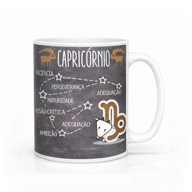 Caneca exclusiva do signo de Caprocórnio com as principais características, a constelação e o símbolo do signo para você surpreender!