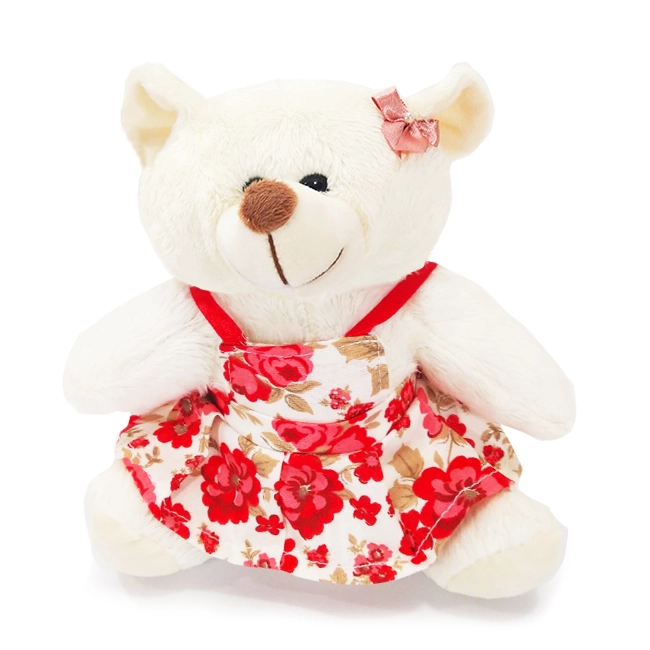 Delicada ursinha de pelúcia com vestidinho em tons de vermelho.